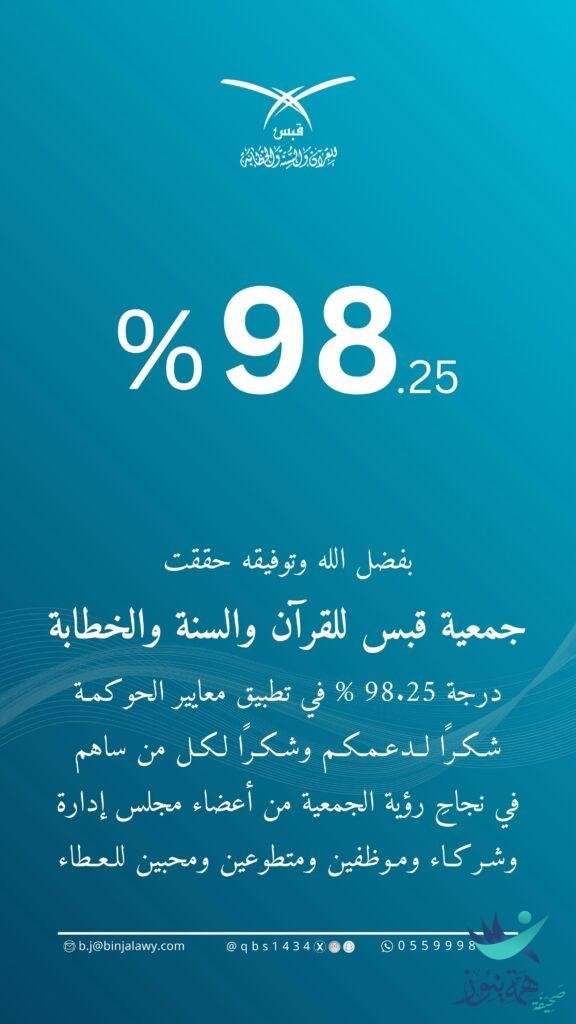 حققت جمعية قبس للقرآن والسنة والخطابة إنجازًا نوعيًا بحصولها على نسبة 98.25% في تقييم الحوكمة الصادر عن المركز الوطني لتنمية القطاع غير الربحيلعام 2025م، لتواصل مسيرتها في تعزيز الشفافية والكفاءة والالتزام المؤسسي.