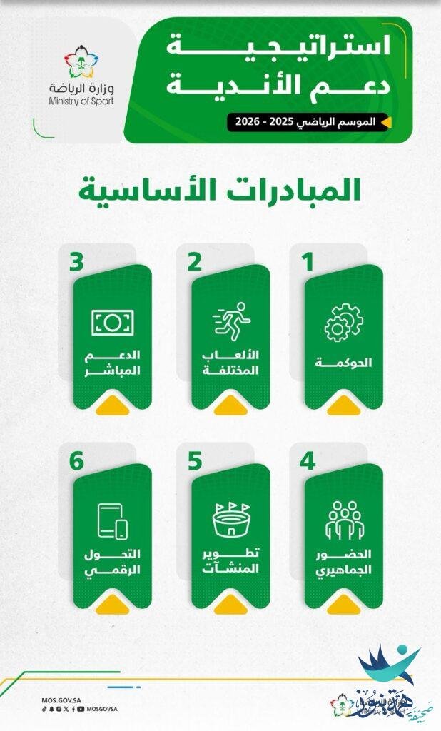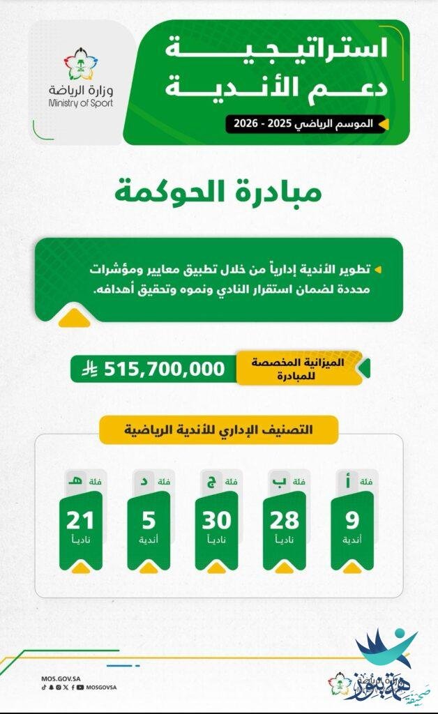 أعلنت وزارة الرياضة اليوم، عن استراتيجية دعم الأندية في عامها السابع وفق خطة متكاملة، ومن خلال نظام حوكمة فعّال للأندية في مختلف مناطق المملكة، بهدف تشغيل وتطوير الأندية لضمان استدامتها إداريًّا وماليًّا.