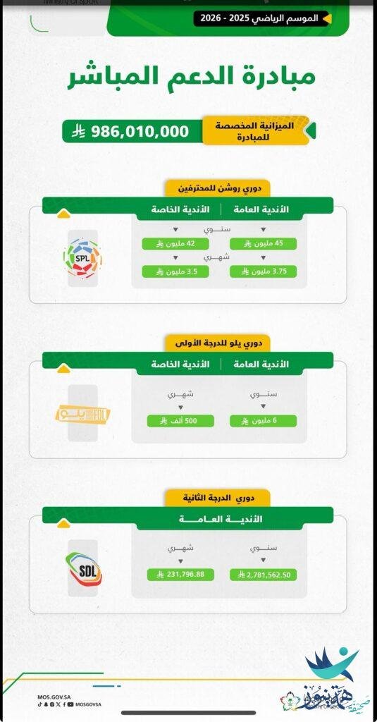 وتضمنت التعديلات في مبادرة “الدعم المباشر” المقدم للأندية تحديد مبالغ الدعم بحسب نوع النادي، والذي يشمل أندية “روشن – يلو – الدرجة الثانية” بمجموع 68 ناديًا، وبميزانية تُقدّر بـ 986,010,000 مليون ريال.