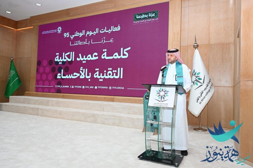 شهد صباح اليوم الأربعاء سعادة عميد الكلية التقنية بالأحساء، م. أحمد بن أبوبكر البدنة، احتفال الكلية باليوم الوطني السعودي الـ95 تحت شعار “عزنا بطبعنا”، الذي نظمته وحدة الأنشطة في مسرح الكلية بمبنى رقم (9)، بحضور وكيل شؤون المتدربين أ. محمد بن خالد الشريدي، ووكيل الجودة أ. صالح بن علي السعيد، وعدد من رؤساء الأقسام ومديري الوحدات وأعضاء الهيئة التدريبية والإدارية والمتدربين.