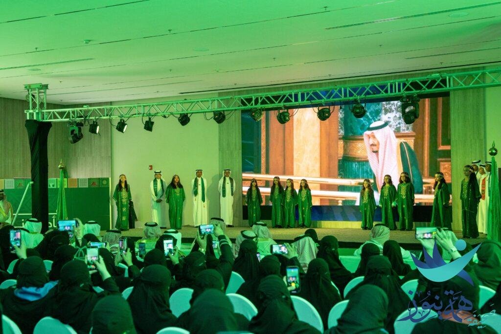 كما أُلقى الشاعر ناجي حرابه قصيدة وطنية قبل أن يُختتم الحفل بأوبريت وطني بعنوان “عزّنا بطبعنا”، ثم شارك الحضور في أداء العرضة السعودية، وسط أجواء وطنية جسدت مشاعر الفخر والولاء للوطن وقيادته.