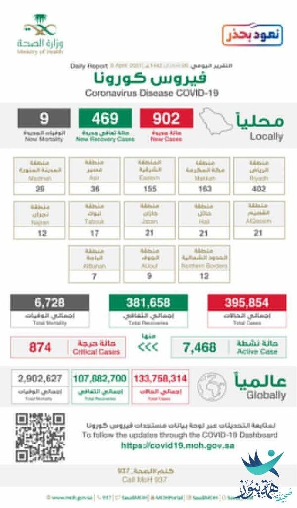 وفي نفس السياق أعلنت الصحة إحصائية جديدة لمستجدات كورونا في المملكة خلال ال24 ساعة الماضية تضمنت تسجيل (902) حالة مؤكدة وتعافي(469) حالة فيما بلغ عدد الحالات النشطة (7468) منها (874) حالة حرجة.