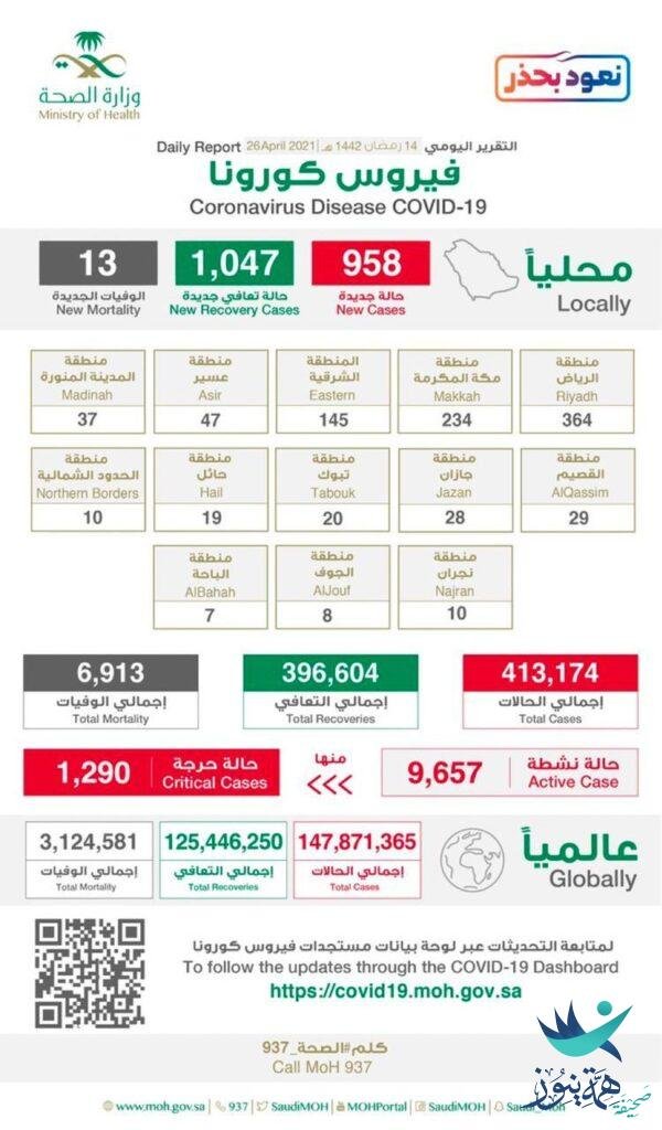 أعلنت وزارة الصحة دخول 44مصابا بفايروس كورونا في نطاق الحالات الحرجة خلال ال٢٤ساعة الماضية ليبلغ الإجمالي 1،290حالة حرجة.. ووزارة الصحة اليوم تعلن عن تسجيل إصابة 958 جديدة بفايروس كورونا في السعودية. وتعلن عن تسجيل 1047حالة تعافي جديدةمن فايروس كورونا ، بينما وصل عدد الوفيات لهذا اليوم الى13حالة
