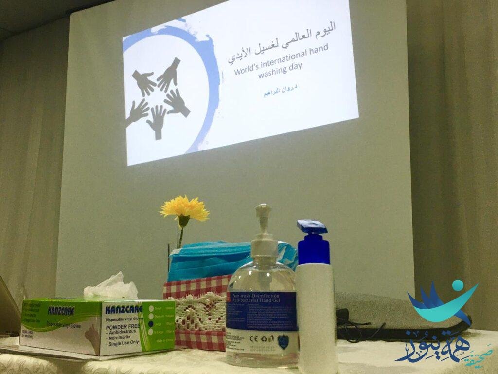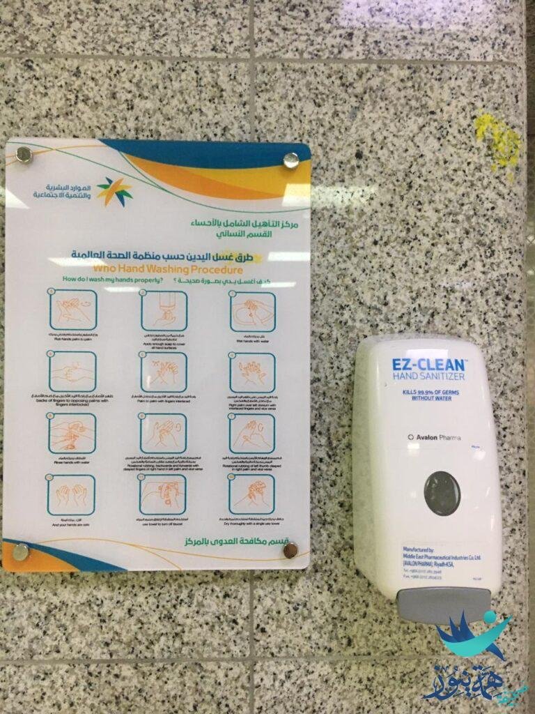 وتأكيد من مديرة القسم النسائي عبير الحمد على أهمية الفعاليه وحرصاً منها على سلامة الجميع تم تركيب لوح إرشادية في جميع مرافق المركز عن الطريقة السليمة لغسيل الأيدي بالتنسيق مع العلاقات العامة والإعلام ولجنة مكافحة العدوى.
