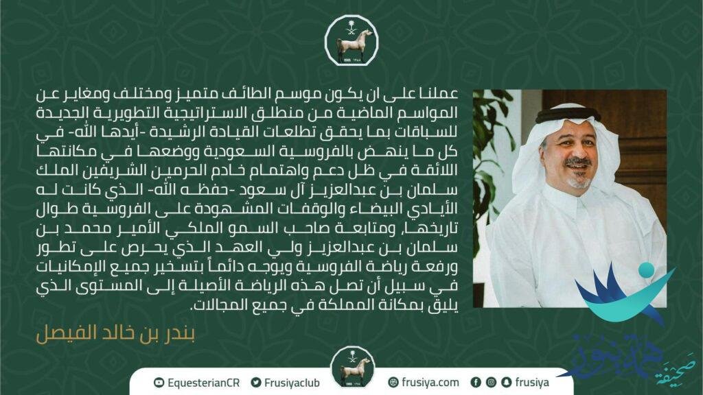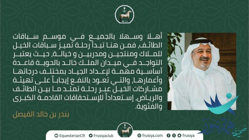 ورحب رئيس هيئة الفروسية رئيس مجلس إدارة نادي سباقات الخيل صاحب السمو الملكي الأمير بندر بن خالد الفيصل بالجميع في موسم سباقات الطائف، وقال: من الطائف تبدأ رحلة تميز سباقات الخيل للملاك ومنتجين ومدربين و خيالة، حيث يعتبر التواجد في ميدان الملك خالد بالحوية قاعدة أساسية مهمة لإعداد الجياد بمختلف درجاتها وأعمارها، والتي تعود بالنفع إيجاباً على تهيئة مشاركات الخيل عبر رحلة تمتد ما بين الطائف والرياض، إستعداداً للإستحقاقات القادمة الكبرى والفئوية.