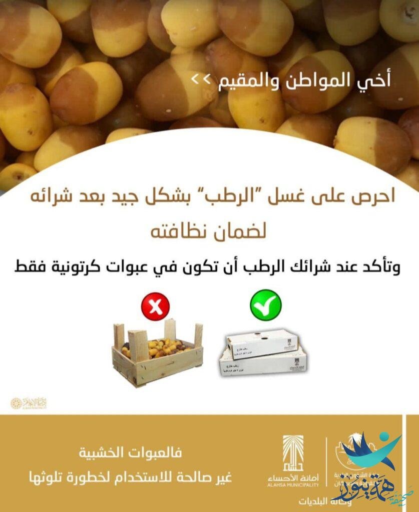 شددت أمانة الأحساء على منع بيع محصول ” الرطب ” في الصناديق الخشبية ، مُهيبةً بالمواطنين والمقيمين بإبتياع المحصول المُعبأ في العبوات الكرتونية بوزن ” 1،2 كيلوجرام ” ، مؤكدة على أن دورها الرقابي والإشرافي يتمثل في متابعة ذلك في النطاق العمراني فقط .