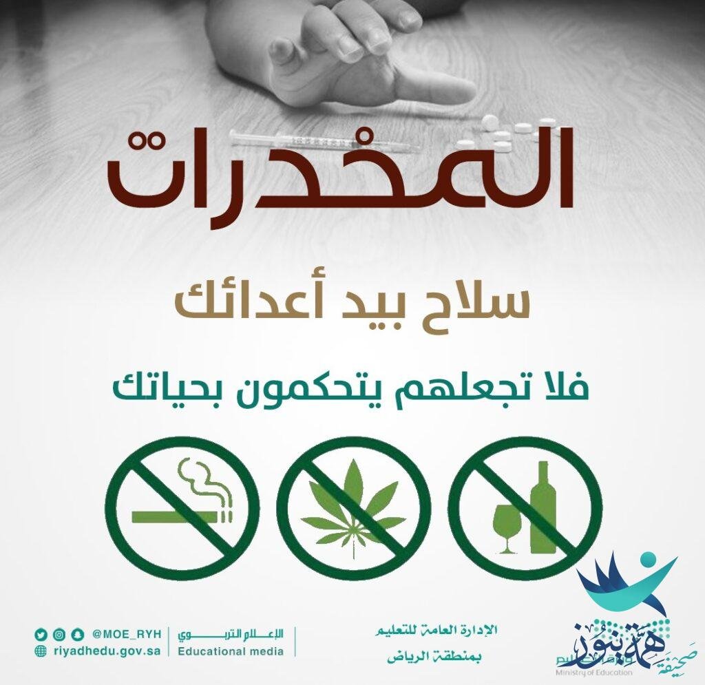 تشارك الإدارة العامة للتعليم بمنطقة الرياض في الاحتفاء باليوم العالمي لمكافحة المخدرات والذي يوافق 26 يونيو من كل عام .
