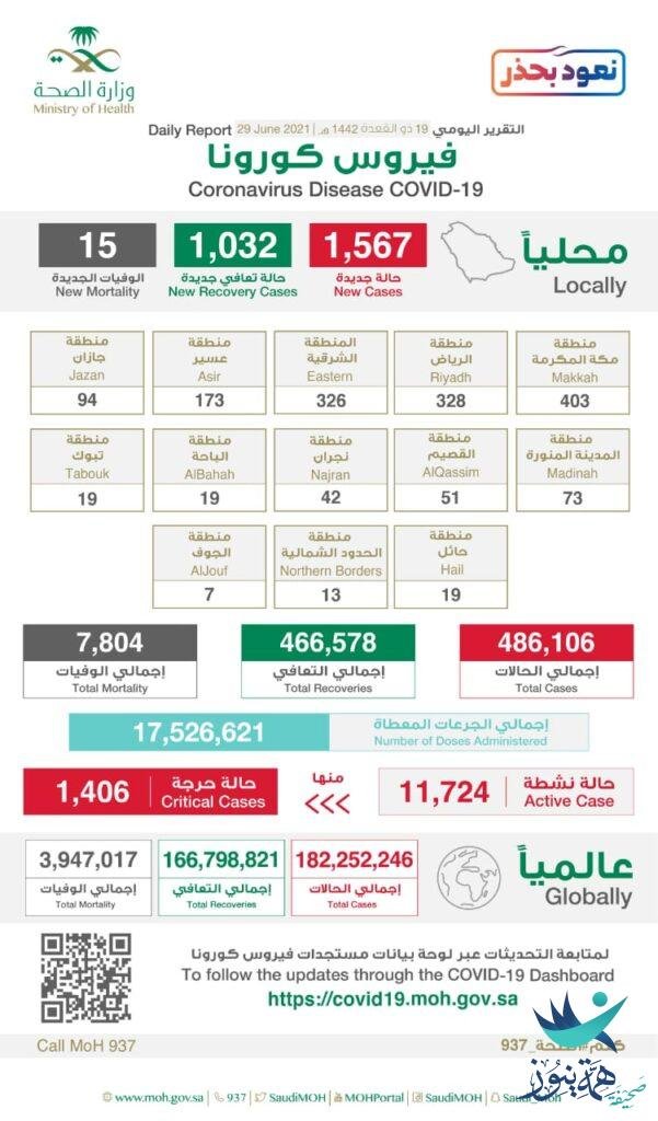 وفي نفس السياق أعلنت الصحة إحصائية جديدة لمستجدات كورونا في المملكة خلال ال24 ساعة الماضية تضمنت تسجيل (1567) حالة مؤكدة وتعافي(1032) حالة فيما بلغ عدد الحالات النشطة (11724) حالة منها (1406) حالات حرجة.