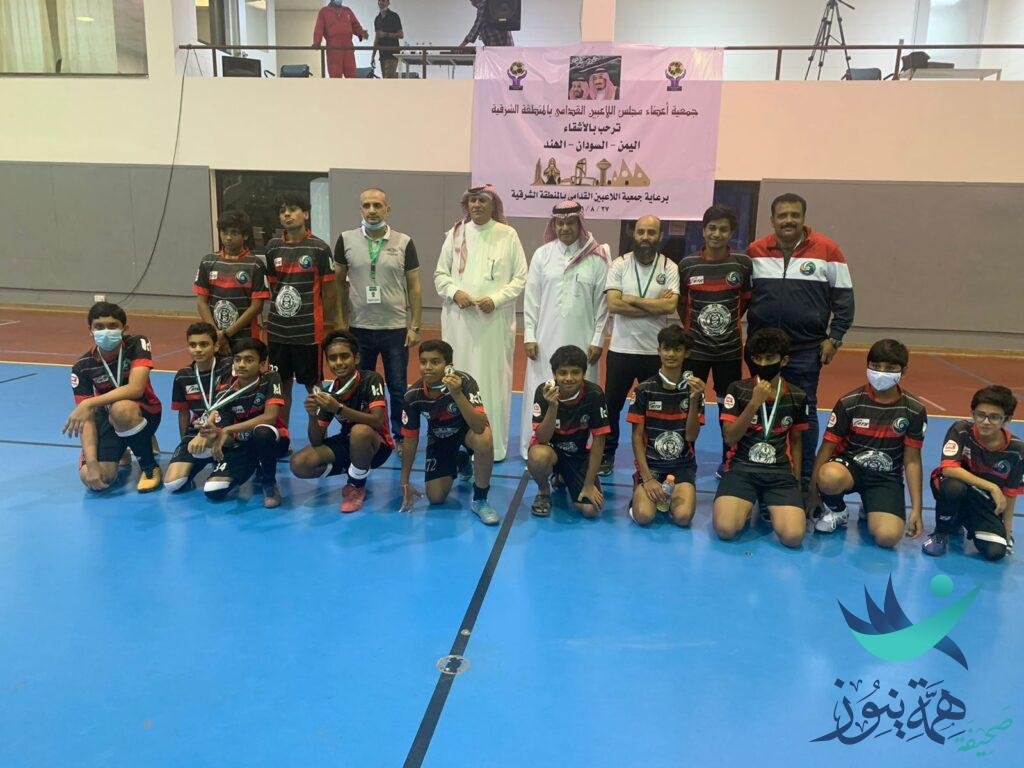بحضور رئيس نادي النهضة الأستاذ طارق الحبيشي والرئيس التنفيذي بدرالعويس والأستاذ عبدالله جاسم مدير منتخب المملكة للناشئين السابق ، ورئيس الجالية السودانية السيد أحمد الأحمر ونائبه وأعضاء مجلس الجالية ورئيس الجالية اليمينة ورئيس الجالية الهندية ورئيس جمعية اللاعبين القدامى بالشرقية الأستاذ أحمد النباط ونائبة الأستاذ جمال محمد والرئيس التنفيذي الأستاذ عبدالسلام مهنا والدكتور إبراهيم حفني والأستاذ منير بوبشيت مدير المركز الإعلامي بنادي النهضة والأستاذ فؤاد السليم والأستاذ عصام الخميس والإعلامي حمود الزهراني ، وعدد من الشخصيات والجماهير السودانية واليمنية والهندية توج الأستاذ أحمد النباط والأستاذ جمال محمد وعبدالله جاسم وحمودالزهراني فريق ناشئ الجاليات السودانية بكأس البطولة الرباعية الدولية التي أقيمت على صالة نادي النهضة بالدمام مساء أمس الجمعة 19-1-1443هـ في البطولة التي أشرف على تنظيمها جمعية اللاعبين القدامي بالشرقية وتنسيق الدكتور إبراهيم حفني المشرف على المناسبات والتي شارك فيها ناشئ المملكة العربية السعودية وناشئي الجاليات السودانية وناشئي الجاليات اليمنية وناشئي الجاليات الهندية وتوج فريق ناشئي الجاليات السوداني بعد فوزه على اليمن بهدف في الدور التمهيدي وفوزه على ناشئي الجاليات الهندية بثلاثية في النهائي ليتوج بالكأس والميداليات الذهبية ويتوج ناشئي الجاليات الهندية بالميداليات الفضية ، وقد بدأت البطولة الساعة الثامنة مساء بالقرآن الكريم ثم كلمة للأستاذ أحمد النباط رحب فيها بالجميع في هذه البطولة وأشاد بالدور الكبير الذي يقوم به صاحب السمو الملكي الأمير سعود بن نايف امير المنطقة الشرقية ونائبه صاحب السمو الملكي الأمير احمد بن فهد بن سلمان والإهتمام الكبير بالرياضة والرياضيين في المنطقة الشرقية .