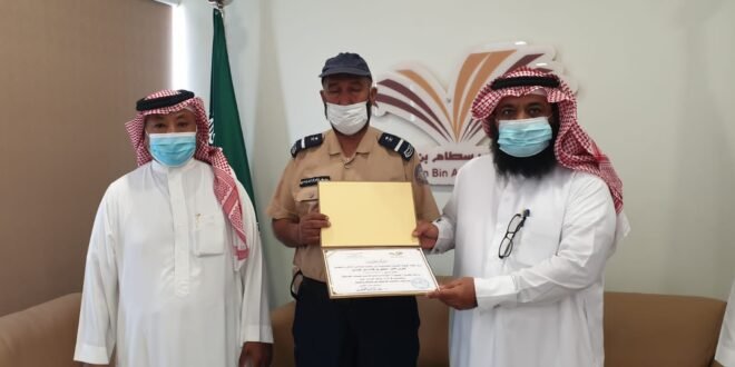 كرّم عميد كلية الآداب والعلوم في محافظة وادي الدواسر الدكتور عمر بن نوح المطيري اليوم في مكتبه الموظف عايض بن فلاح المصارير , أحد منسوبي الأمن والسلامة بالكلية ، تقديراً لدوره في تطبيق الاحترازات الوقائية بالكلية أثناء عمله على الجميع للوقاية من فيروس كورونا المستجد (كوفيد-19).