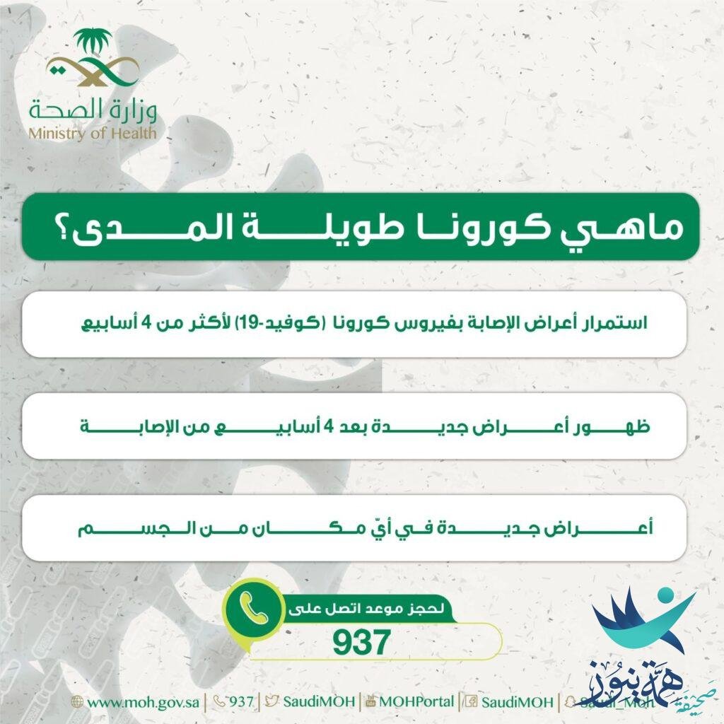 أطلقت وزارة الصحة عيادة ما بعد الإصابة بفيروس كورونا، تحت مسمى” أعراض كورونا طويلة المدى”، وذلك إستمراراً لجهودها للتصدي للجائحة وإكمال الخدمة الطبية للمرضى المصابين بفيروس كورونا المستجد كوفيد ١٩ ، حيث تستهدف هذه العيادة المرضى الذين تستمر لديهم أعراض بعد شهر من الاصابة بالفيروس وإعداد الخطة العلاجية المناسبة لهم في المستشفيات الرئيسة وذلك في جميع المناطق والمحافظات، ويُمكن حجز موعد في عيادات ما بعد الاصابة بفيروس كورونا المستجد من خلال الإتصال على 937