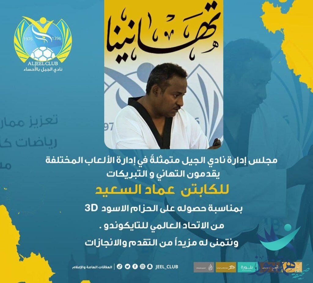 هذا ويذكر بأن البطل عبدالرحمن السعيد هو إبن الكابتن الخلوق عماد السعيد مدرب لعبة التايكوندو في نادي الجيل السعودي والحاصل مؤخراً على الحزام الأسود 3D من الاتحاد العالمي للتايكوندو والمصنف العالمي في اللعبة.