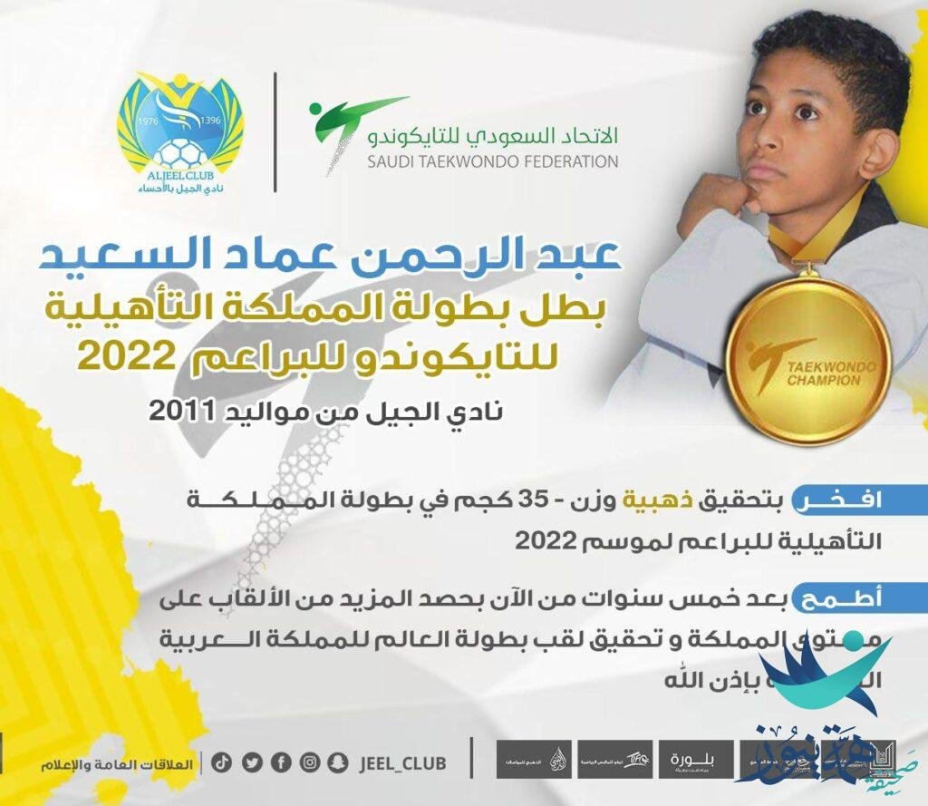 حقق بطل المستقبل عبدالرحمن بن عماد السعيد لاعب نادي الجيل السعودي مواليد عام 2011 بطولة المملكة التأهيلية للتايكوندو للبراعم 2022 الميدالية الذهبية وزن 35 كجم.