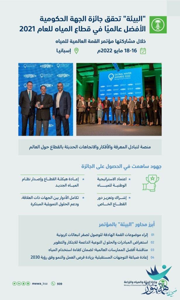 حققت المملكة العربية السعودية ممثلة في وزارة البيئة والمياه والزراعة إنجازًا عالميًا رفيع المستوى بحصولها على جائزة الجهة الحكومية الأفضل في قطاع المياه للعام ٢٠٢1م حول العالم، وذلك من خلال مشاركتها في مؤتمر “قمة المياه العالمية” والذي عقد فعالياته في العاصمة الإسبانية مدريد خلال الفترة (16 -18) مايو الجاري.