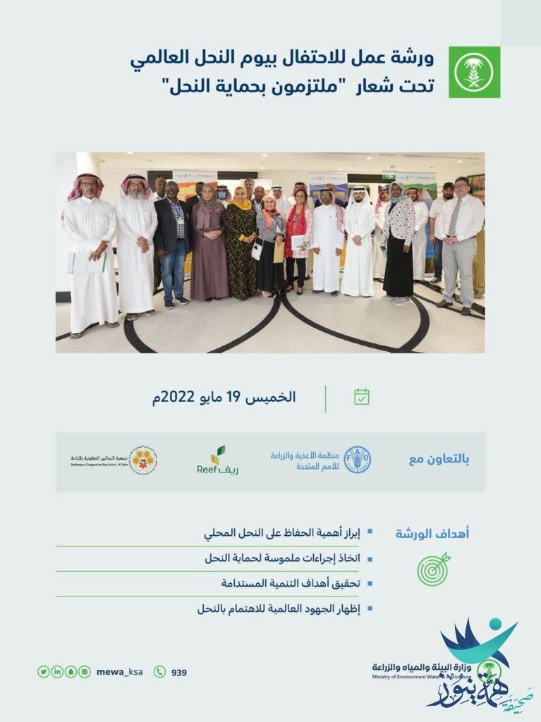 أقامت وزارة البيئة والمياه والزراعة بالتعاون مع برنامج التنمية الريفية الزراعية المستدامة (ريف)، وجمعية النحالين التعاونية بالباحة، ومنظمة الأغذية والزراعة للأمم المتحدة (فاو)، بالرياض اليوم، ورشة عمل بمناسبة الاحتفال بيوم النحل العالمي، تحت شعار (ملتزمون بحماية النحل).