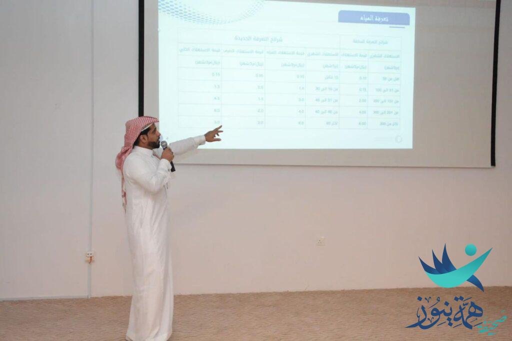 حيث تم بالتناوب بالحديث بين ممثلي شركة المياه والذين أكدوا على رؤية الشركة ورسالتها وأهدافها والمتمثلة في رفع مستوى الوعي لدى المجتمع لترشيد كمية الاستهلاك ، وتقديم حلول الإستفادة المستدامة من الموارد المائية ، والأسباب المؤدية لارتفاع قيمة الفاتورة والحلول الارشادية واهم الإرشادات للكشف عن التسرب ..