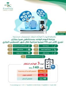 ويأتي ذلك حرصاً من الصحة على تقديم الخدمة لجميع المستفيدين وإنهاء جميع قوائم الانتظار للعمليات الجراحية في جميع مستشفيات المنطقة وذلك ضمن مشروع قوائم انتظار العمليات للتخصصات المختلفة.