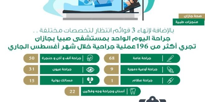 أجرى قسم جراحة اليوم الواحد بمستشفى صبيا العام 196 عملية جراحية في مختلف التخصصات خلال شهر أغسطس للعام الحالي 2022م .