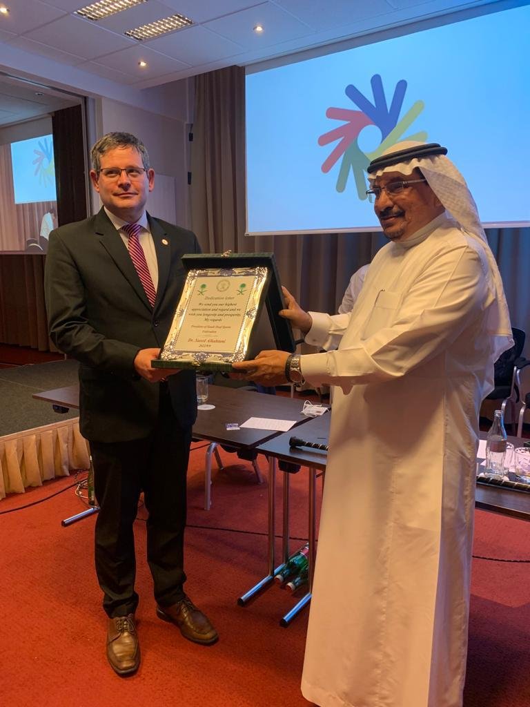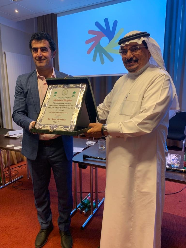 وفي ختام الموتمر قدم رئيس الاتحاد السعودي لرياضة الصم درع تذكاري للرئيس الجديد للجنه الدوليه وكذلك رئيس الاتحاد الاسيوي لرياضة الصم السيد محمد برغار.
