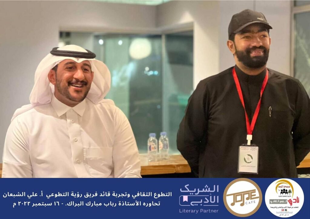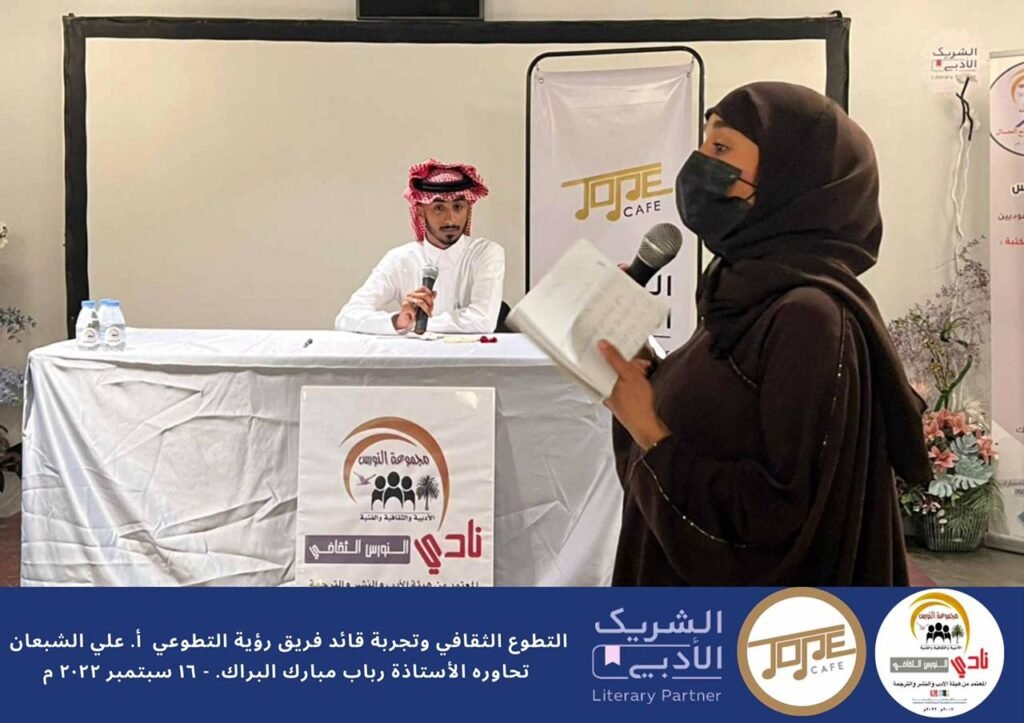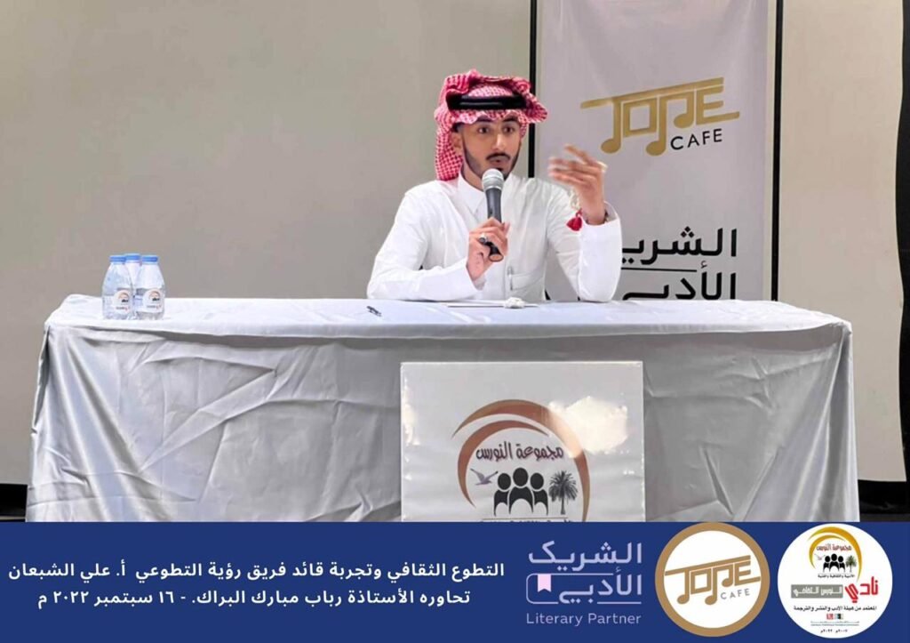 النورس الثقافية أشاعت ظاهرة التطوع الثقافي خلال حركة مسيرتها في الفعل الثقافي ومن خلال ابتكار الفعاليات المميزة قدم الشريك الأدبي في مقهى تون بالهفوف فعالية”التطوع الثقافي” وتجربة قائد فريق رؤية التطوعي أ. علي بن محمد الشبعان بحضور عدد يتجاوز ٤٠ متطوع ومتطوعة حضورية وناشطين وناشطات عبر البث المباشر والمتابعة عن البعد ، حيث يقدر الفريق بعدد يتجاوز المائة متطوع ثقافي يساهمون في تنظيم الفعاليات والمهرجانات والمناسبات المتنوعة ، حيث إنطلقت الفعالية في تمام الساعة الثامنة مساء يوم الجمعة ليلة السبت ٢٠ صفر ١٤٤٤هـ الموافق ١٦ سبتمبر ٢٠٢٢م.